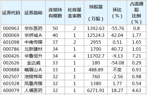 社保基金持有期限最长的个股是华东医药,自2008年四季度以来已累计持有50个季度。社保基金持有期限较长的还有华侨城A、中南传媒、华鲁恒升等,已连续持有40、37、34个季度。持仓变动来看,36只连续重仓股中,一季度末社保基金持股量环比增持的有9只,环比增仓幅度较大的有华侨城A、北新建材、人福医药等。