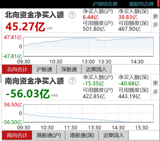 5月10日消息,沪深股市尾盘有所拉升,北向资金净流入45.27亿元,其中,沪股通净流入6.44亿元,深股通净流入38.83亿元。