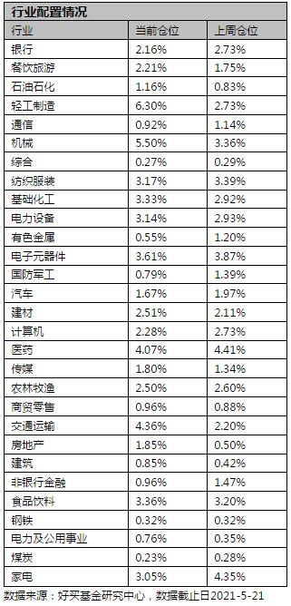 整体来看,基金配置比例位居前三的行业是轻工制造、机械和交通运输,配置仓位分别为6.30%、5.50%和4.36%;基金配置比例居后的三个行业是煤炭、综合和钢铁,配置仓位分别为0.23%、0.27%和0.32%。