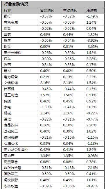行业配置方面,轻工制造、机械和交通运输三个板块被公募基金主动相对大幅加仓,幅度分别为3.57%、2.16%和2.14%;基金主要减仓了家电、有色金属和国防军工三个行业,减仓幅度分别为1.30%、0.65%和0.59%。