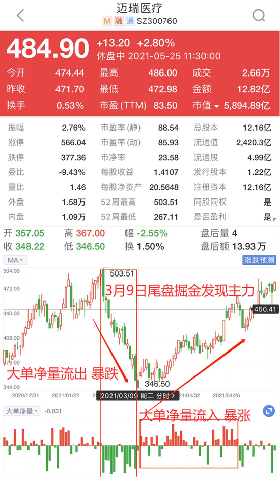 但如果我们使用尾盘掘金和查股网Level-2便可提前发现主力行动。2021年3月9日,尾盘掘金发现了主力潜伏迈瑞医疗的迹象,并在当天14点50分进行了异动提醒。同时,查股网Level-2大单净量的数据显示,3月9日当天,大单净量数据的巨幅流出出现了大幅减少,再次明确了主力入场的信号!次日,迈瑞医疗暴涨5.66%。而且在3-4月,存在大单净量持续流入的情形,这表示主力资金正在持续加码,这也推动了股价的不断上涨,迈瑞医疗的股价从360元左右涨到了当前的480元以上,涨幅超过了30%。