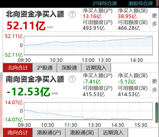 沪深股市尾盘走高,北向资金大幅流入52.11亿元,其中,沪股通净流入13.16亿元,深股通净流入38.95亿元。