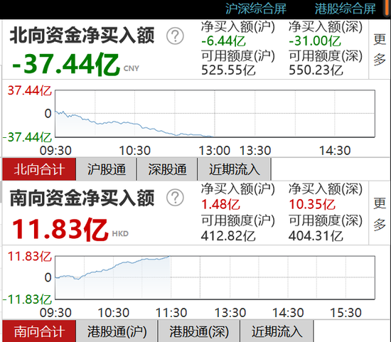 午评:北向资金净流出37.44亿元 深股通净流出31亿元