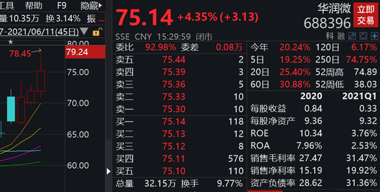 6月11日,华润微总市值在盘中首次突破千亿大关,收报75.14元,本周累计大涨19.25%。