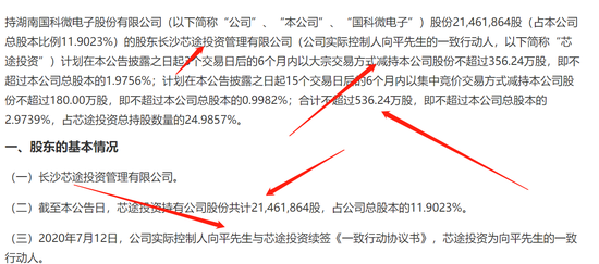 在国科微股价翻番期间,公司实控人抛出了减持计划。根据国科微5月11日披露的股东减持股份预披露公告,公司第三大股东长沙芯途投资管理有限公司(公司实际控制人向平先生的一致行动人,下称“芯途投资”)出于自身资金需求,拟通过大宗交易和集中竞价的方式合计减持不超过536.24万股,即不超过本公司总股本的2.9739%,占芯途投资持股数量的24.9857%。