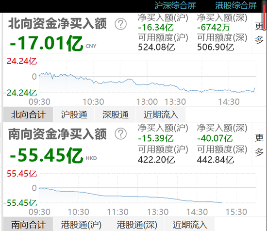 截至沪深股市收盘,北向资金全天净卖出17.01亿元,其中沪股通净卖出16.34亿元,深股通净卖出0.67亿元。此外,南下资金大幅流出港股55亿港元。