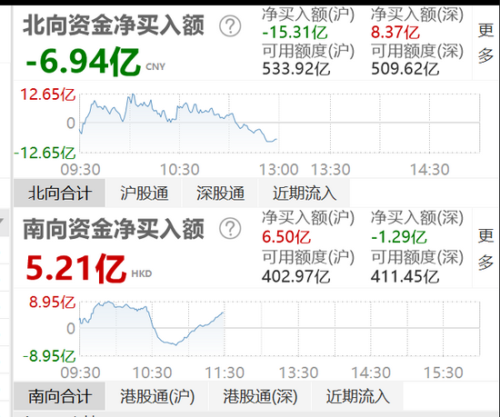 沪深股市早盘窄幅震荡,北向资金半日净流出6.94亿元,其中,深股通获净流入8.37亿元。