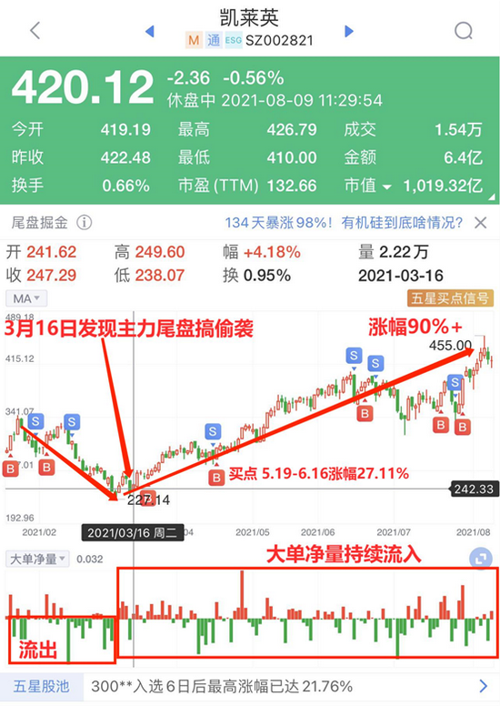 3月16日,尾盘掘金发现主力在凯莱英的尾盘搞偷袭,并在当天14点50分进行了预警提示。查股网Level-2大单净量的数据显示,其实3月中旬开始,凯莱英的大单净量资金就开始了持续介入的状态,这也推动了股价的不断上涨,凯莱英的股价从3月初的228元左右最高涨到了455元,涨幅90%+。