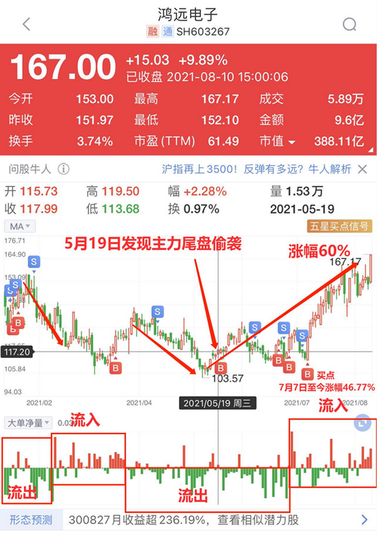 5月19日,尾盘掘金发现主力在鸿远电子的尾盘搞偷袭,并在当天的14点50分进行了预警提示。同时,当天查股网Level-2的大单净量也从流出变为了流入,这意味着有主力资金在行动。