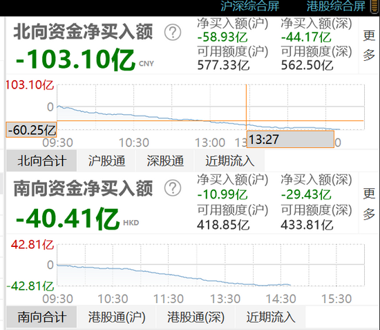 沪深股市大跌,北向资金净流出103.1亿元,其中,沪股通净流出58.93亿元,深股通净流出44.17亿元。