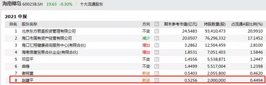 海南椰岛发布的半年报显示,赵建平进入公司前十大流通股东名单,报告期末共持有200万股。不过,由于海南椰岛前十大流通股东“进入门槛”较一季度末有所降低,因此无法断定其是第二季度买入还是此前已实施“潜伏”。