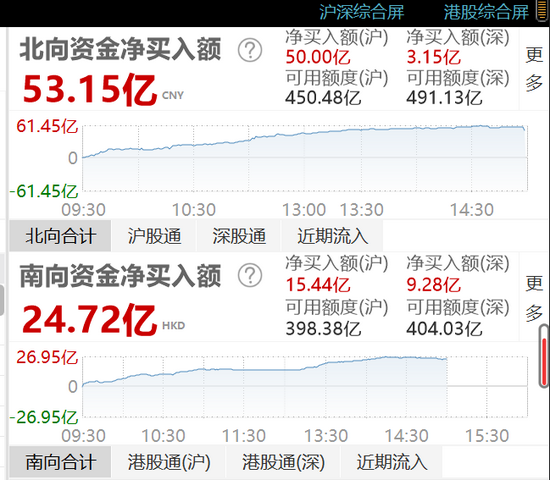 沪深股市集体走高,北向资金净流入53.15亿元,沪股通净流入50亿元,深股通净流入3.15亿元。