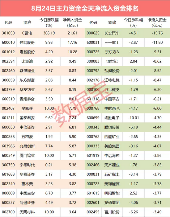 沪指8月24日涨1.07%,深证成指涨0.88%,主力资金全天净流出145.74亿元。其中,创业板主力资金净流出47.47亿元,沪深300成份股主力资金净流入44.76亿元。