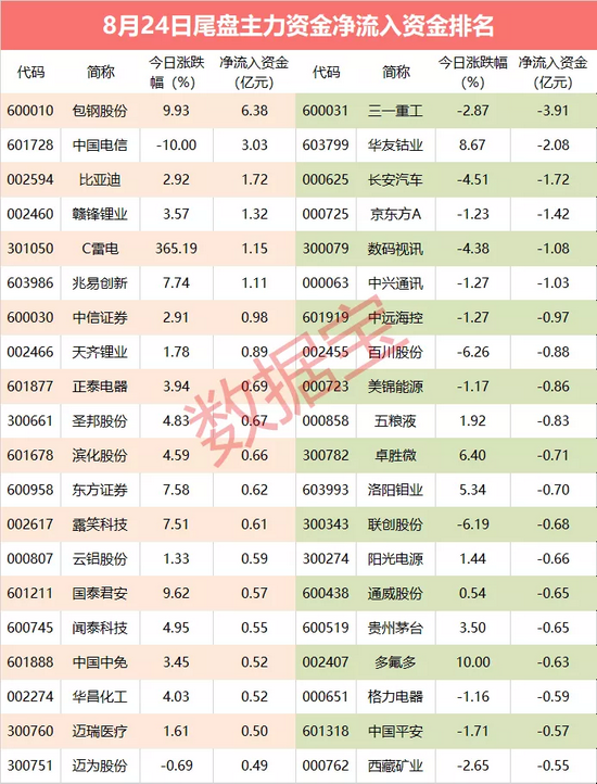 从个股尾盘资金流向数据看,有35股尾盘净流入资金超过3000万元,包钢股份、中国电信、比亚迪等个股尾盘资金净流入金额最多,分别达6.38亿元、3.03亿元、1.72亿元;三一重工、华友钴业、长安汽车等个股尾盘资金净流出金额居前,分别流出3.91亿元、2.08亿元、1.72亿元。