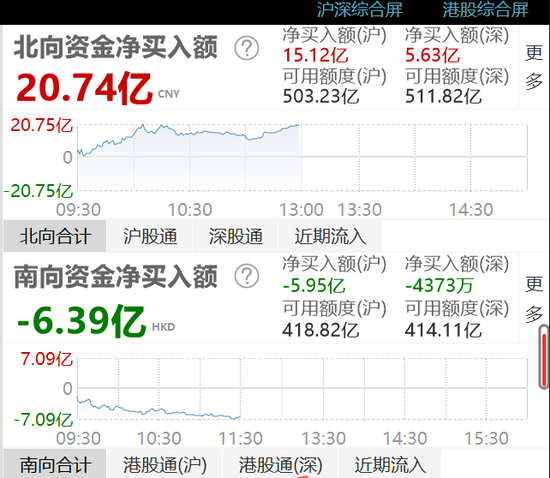 沪深股市走势分化,截至午盘,北向资金净流入20.74亿元,沪股通净流入15.12亿元,深股通净流入5.63亿元。