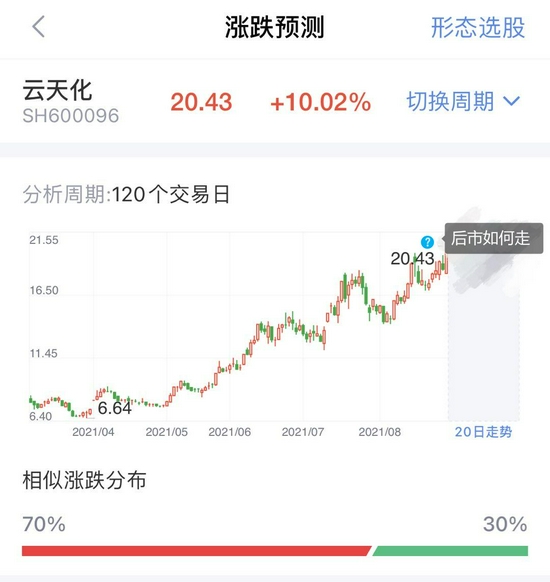 以今日强势涨停的云天化为例,利用查股网-形态识金对其现有120天的形态走势,分析了该股未来20天的走势预测,强劲走势能否持续?打开查股网-形态识金速来解锁>>未来走势也就不再成迷!