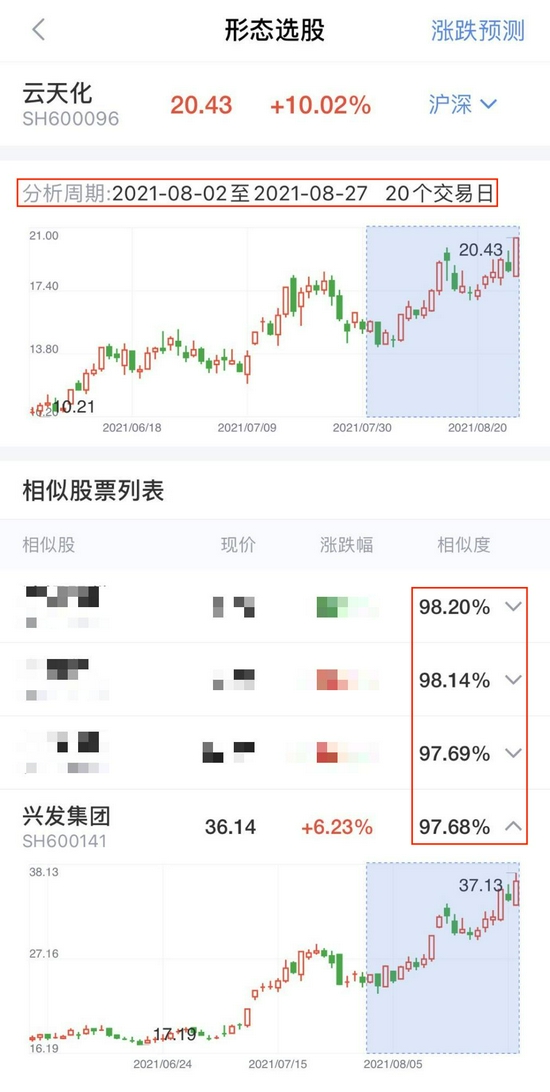 再选取云天化近一段时间的走势,也就是8月2日-8月27日的一段K线走势,利用查股网-形态识金寻找跟他近期强劲走势相似的前20只个股。选取前四只个股发现,相似度均超97%!相似度排在第四名的神秘个股兴发集团,近6个交易日大涨20%,后市走势值得期待!