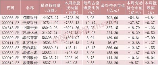 本周持仓市值减少额前十的股票中,除美的集团、宝钢股份分别被北向资金加仓145.41万股、2203.19万股外,其他股均被北向资金减仓,其中招商银行、平安银行、中国平安、海尔智家、北方稀土被北向资金减仓超1000万股。