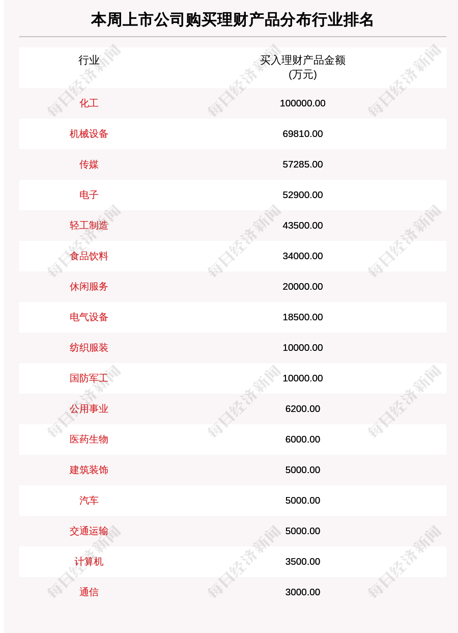 从上市公司所属行业上来看,本周买入理财产品金额排名前三的行业分别是化工、机械设备、传媒。