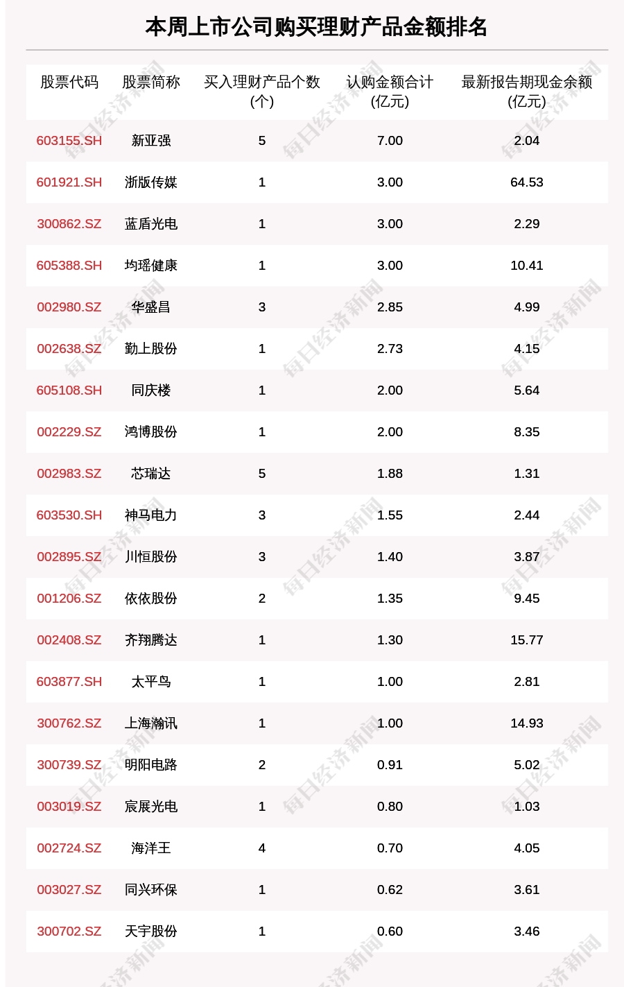 从买入金额上来看,购买理财产品金额排名前三的公司是新亚强(603155.SH)、浙版传媒(601921.SH)、蓝盾光电(300862.SZ),买入金额分别为7.00亿元、3.00亿元、3.00亿元。