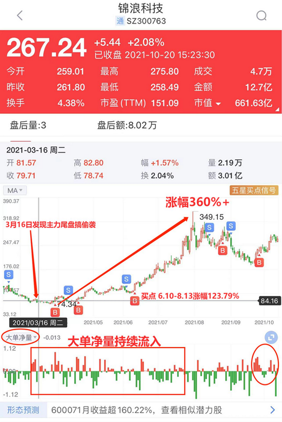 6月10日和8月13日,B/S点也发出了提示信号,锦浪科技从113.45元涨至253.88元,区间涨幅为123.79%。