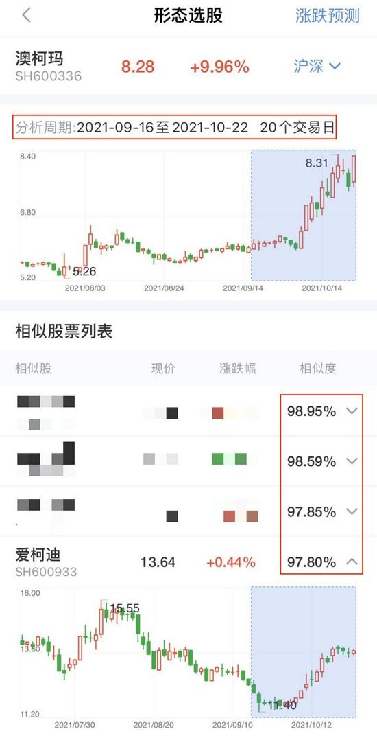 再选取澳柯玛近一段时间的走势,也就是9月16日-10月22日的一段K线走势,利用查股网-形态识金寻找跟他近期强劲走势相似的前20只个股。选取前四只个股发现,相似度均超97%!相似度排在第四名的神秘个股爱科迪,近14个交易日以来也反弹了17%,后市走势值得期待!