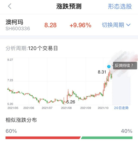 以近期持续大涨的澳柯玛行为例,该股近11个交易日大涨38%,利用查股网-形态识金对其现有120天的形态走势,分析了该股未来20天的走势预测,后市能否持续走强?打开查股网-形态识金速来解锁>>未来走势也就不再成迷!