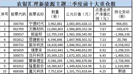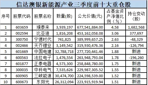 不仅在仓位上进行了调整,冯明远在三季度对重仓股的调整幅度也不小。从信达澳银新能源产业基金的前十大重仓股来看,重仓了璞泰来、比亚迪、宁德时代等个股。