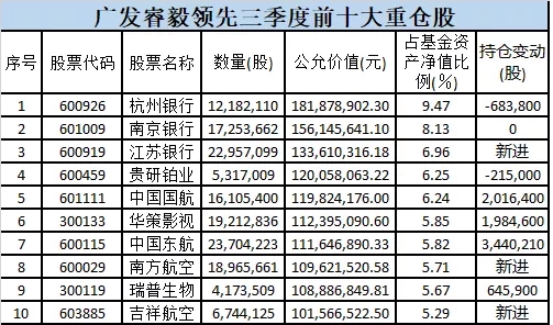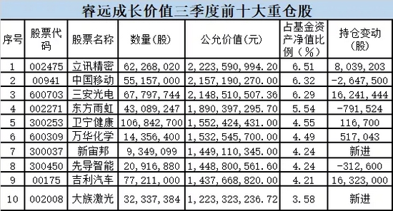 睿远基金另一位明星基金经理赵枫管理的睿远均衡价值三季度前十大重仓品种也基本保持稳定,中国移动、吉利汽车在三季度增持比例较多。