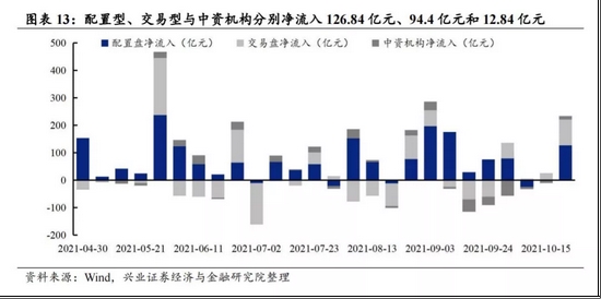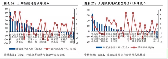 配置盘、交易盘与中资机构同步加仓。根据托管机构类型,我们将陆股通拆解为配置型、交易型与中资机构三类,其中,配置型资金上周转为流入126.84亿元,而交易型资金净流入94.4亿元,连续第四周出现净流入,中资机构净流入12.84亿元。配置型、交易型与中资机构今年以来累计净流入规模分别为3381.8亿元、-88.52亿元和-4.64亿元。