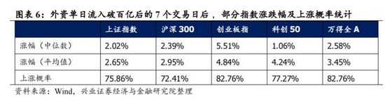 以史为鉴,外资单日净流入破百亿后,市场上涨概率更大,创业板表现更优。我们复盘了历史上29次(剔除2021年10月21和22号)外资净流入破百亿的市场走势后发现:(1)北上资金大规模的当天,受益于充裕的资金面和提振的风险偏好,市场涨幅较为显著;(2) 陆股通大规模的净买入对市场起到明显的提振作用,外资净流入破百亿的7个交易日后,上证指数、沪深300、创业板指、科创50和万得全A指数上涨的概率均在70%以上,其中,创业板指上涨概率为82.8%,涨幅中位数高达5.51%。