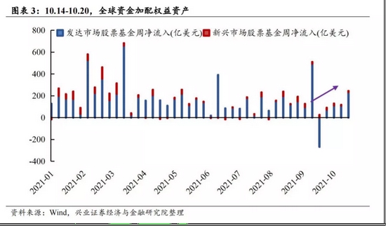 二是中美关系阶段性缓和、海外市场近期回暖,使全球资金的风险偏好回升,带动外资流入A股。短期来看,外资流入A股节奏与VIX指数显著负相关,当海外市场尤其是美股表现较好且全球风险偏好提升时,新兴市场将受益于发达市场的正向“溢出效应”,获得外资加仓。10月5号以来,受美国龙头企业出色的财报催化,美股持续上涨,道琼斯指数22日再创新高。同时VIX指数持续下行,市场风险偏好明显回升,全球资金加配风险资产,据EPFR数据,10.14-10.20全球股票型基金获得超245亿美元流入,较前四周明显上升。另外,近期中美双方互动频繁,10月4日美国贸易代表戴琪表示寻求与中国“坦诚对话”,10月6日中美年内第三次会晤,10月9日刘鹤副总理与戴琪视频通话,中美关系的阶段性缓和也推动外资回流A股。