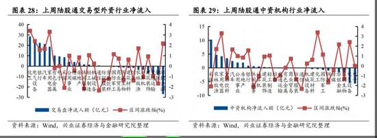 (3)中资机构:主要净流入采掘、农林牧渔和家用电器,净流入规模分别为10.24亿元、4.77亿元和4.21亿元,主要净流出医药生物、电气设备和电子,净流出规模分别为1.71亿元、5.46亿元和5.65亿元。