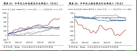 今年以来,北上资金集中加仓电气设备、银行和化工,减仓食品饮料、国防军工和汽车行业。2021年截至10月22日,北上资金净流入电气设备、银行和化工规模居前,分别净流入769.67亿元、390.62亿元和362.52亿元,而净流出食品饮料、国防军工和汽车行业较多,分别净流出273.45亿元、64.79亿元和38.45亿元。