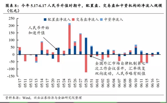 二是近期外资大规模流入中,交易型外资的流入占比过半,后续大概率难以持续。上周233亿元的净流入中,过半的资金来自于偏好短线交易的交易盘和中资机构,二者的交易模式略显“捉摸不透”,单向流入大概率难以持续。以今年5月20日至5月27日人民币突然加速升值时期为例,交易盘净买入近300亿元,但随着5月28日以来,人民币回归双边动的常态且小幅贬值,交易盘在15个交易日内累计流出超300亿元。若本轮人民币单边升值的趋势趋缓,交易盘大概率也将“撤离”A股,回归配置盘主导,后续北上资金将维持平稳流入。