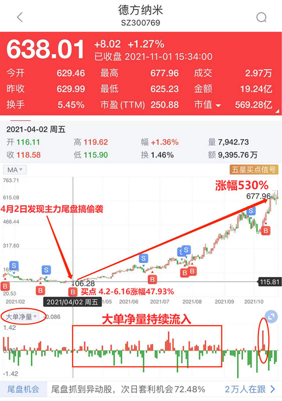 4月2日,尾盘掘金发现了主力在德方纳米的尾盘搞偷袭,并在当天14点50分进行了异动提醒。4月中旬,主力资金开始大幅流入,同时也推动了股价的不断上涨,德方纳米的股价从107元左右涨到了678元左右,最大涨幅超过530%。