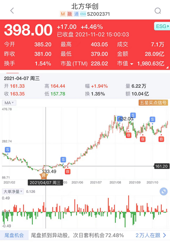 5月17日和8月9日,B/S点也发出了提示信号,北方华创从163.7元涨至373元,区间涨幅为123.51%。