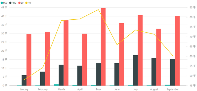 美国:9月份美国的新能源汽车数据为5.55万台,比8月的4.86万台要高一些,同比增长55%左右。1-9月,总的新能源汽车的销量达到了43.5万台,这也是一个很高的数据。9月的数据中,PHEV为1.53万台,BEV为4.02万台。