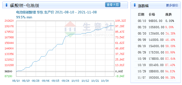这种爆炸式的会顺着产业链传导至最上游的原材料市场,最终结果就是导致了电池级碳酸锂的疯狂涨价。截至11月7日,电池级碳酸锂的报价高达19.3万元/吨,相比8月10日的9.68万元,涨幅高达99.38%,而前后只有3个月的时间。