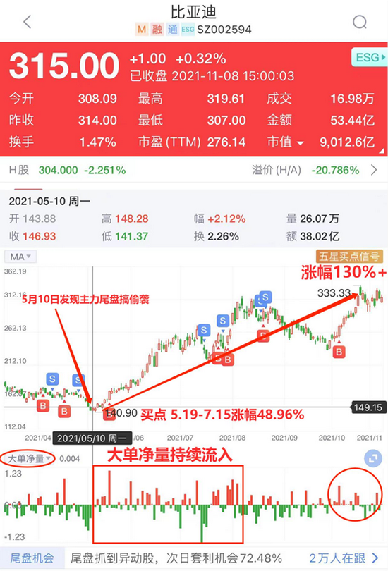 5月10日,尾盘掘金发现主力在比亚迪的尾盘搞偷袭,并在当天的14点50分进行了预警提示。同时,当天查股网Level-2的大单净量也由流出变为了流入,这意味着有主力资金在行动。