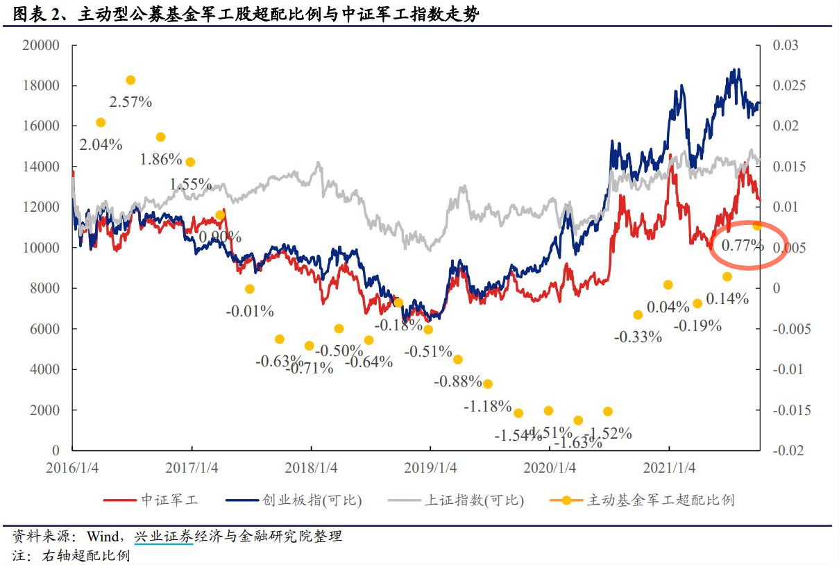 根据公募基金2021年三季报,兴业证券统计的数据显示,截止2021Q3,A股总市值91.3万亿中,155个军工股市值2.86万亿元,占比3.13%,相比2021Q2上升0.22个百分点。相对A股总市值中军工股的占比,主动型公募基金前十大重仓股中军工股市值占比自2016Q2以来整体呈现下降趋势,从2016Q2的超配2.57%降至2020Q1的低配1.63%;在2020年三季度开始的军工行情驱动下,2020Q3、Q4配置比例大幅提升至超配0.04%,2021Q1回落至低配0.19%,随后再次回升,2021Q3为超配0.77%。