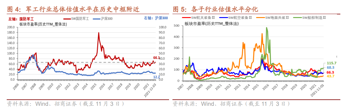1)、年内具有超额收益,行业估值回调充分。年初至今SW国防军工指数上涨2.63%,跑赢沪深300指数10.12个百分点。在28个申万一级行业分类中,国防军工板块2021年涨幅排名第12。目前行业动态估值66倍,处于历史中枢附近,与历史高点来看仍有明显空间,考虑到十四五期间行业业绩持续兑现,目前行业估值仍处于合理水平,而随着估值切换到2022年,行业估值水平再次回落,具备再次上涨的估值空间。