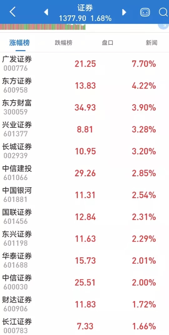 受此消息刺激,券商股今日全面上涨无一下跌,板块指数一度放量上涨近3%,半日成交超昨日全天成交。广发证券单边上扬,一度触及涨停,东方财富、东方证券等纷纷大幅拉升。