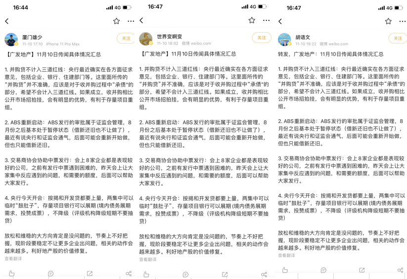 11月10日,有报道称:对于地产收并购,近期部分央企国企向监管部门反映,如果要做一些承债式收购,“三条红线”就会被突破,建议监管部门对“三条红线”相关指标予以调整。
