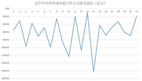 而从近半年内的21个交易周来看,本周超大单主力资金净流出金额处于低位。