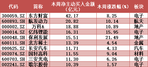 本周,长期以来在低位震荡的房地产股和券商股明显受到资金关照,表现更为活跃。各自的龙头东方财富被净主动买入超过42亿元居首,再度逼近历史高点;而万科A被净主动买入近19亿元,从近3年的低位强力反弹。另外,半导体概念股的活跃也让三安光电、歌尔股份这些老牌电子股迎来主力资金净流入。