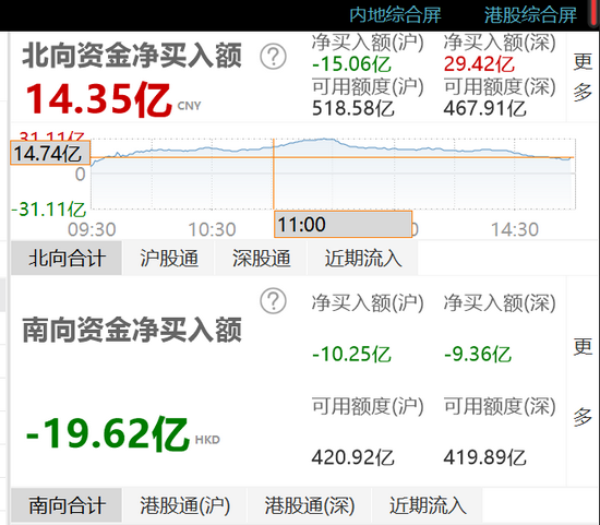截至沪深股市收盘,北向资金全天小幅净买入14.35亿元,其中沪股通净卖出15.06亿元,深股通净买入29.42亿元。
