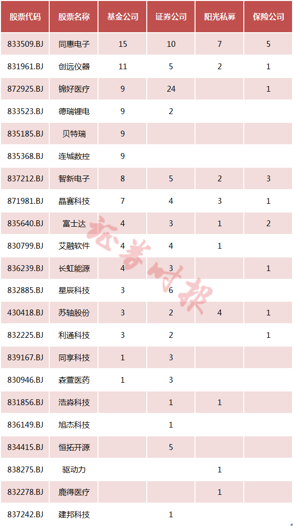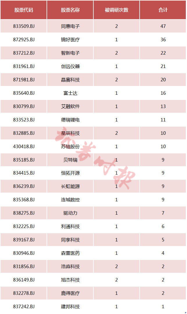据证券时报记者统计,北交所开市以来,已有22家公司获得机构投资者调研,同惠电子、智新电子、晶赛科技等多家企业获机构2次调研。