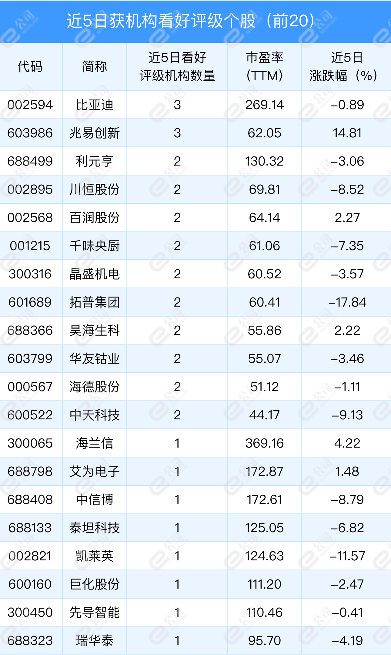2只个股在近期被机构集中推荐,近5日内机构给予“买入”或“增持”等看好评级家数均逾3家及以上。具体来看,包括比亚迪、兆易创新、利元亨、川恒股份、百润股份等在内的12只个股期间机构看好评级家数均在2家以上。
