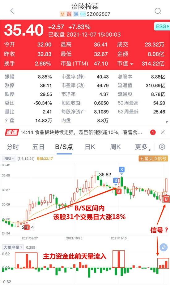 以持续大涨的涪陵榨菜为例,通过查股网Level-2的大单净量发现,此前,B/S点信号信发出并伴随着主力资金的持续流入,该股在B/S区间内,31个交易日大涨18%。而近期,B/S点信号再度发出,主力资金也大幅流入该股,意味着该股近期再获市场的关注。